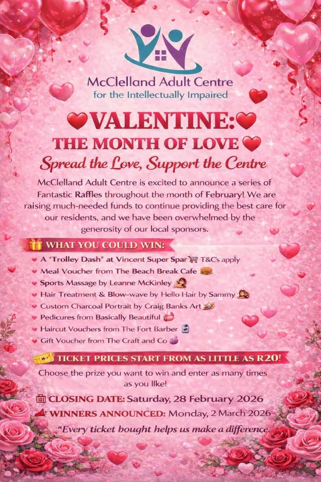Due to the incredibly positive response we have received thus far, we have been requested to extend the closing date of our Valentine’s Raffle!